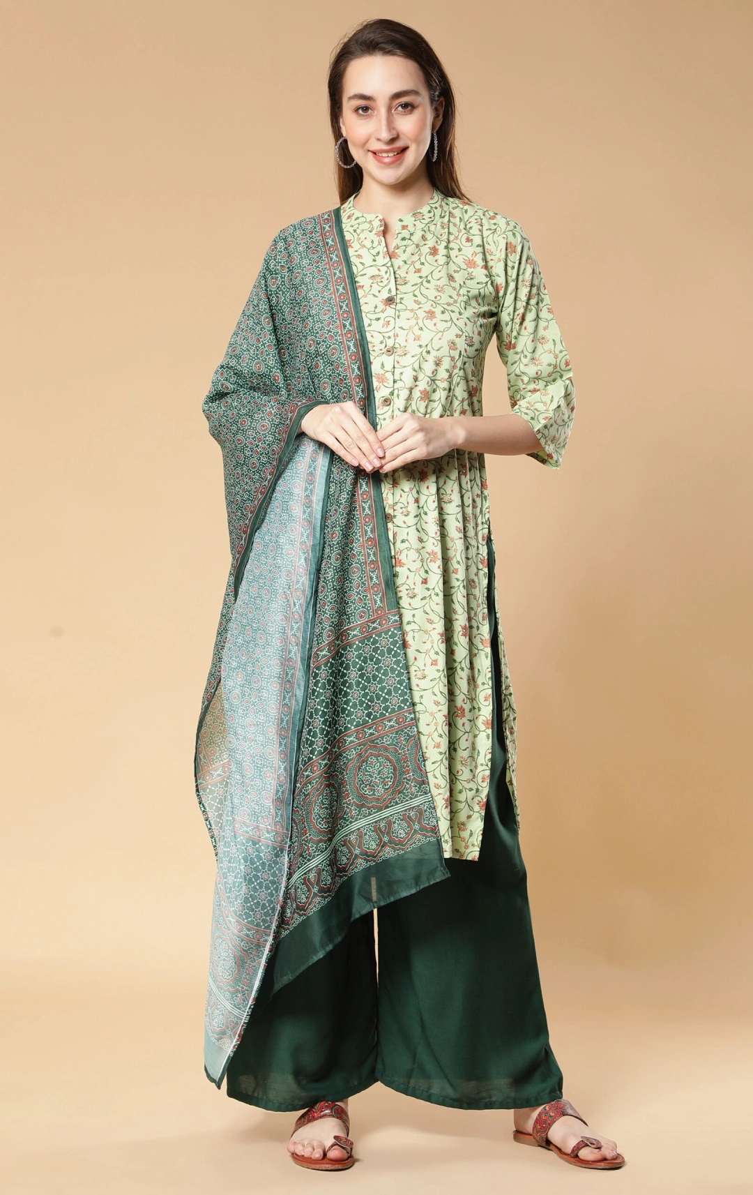 Mint kurti from Srimanglam is made from quality rayon fabric. Mint a-line rayon kurta, has a three-quarter sleeves, mandarin neck, flared hem, gold foil print, and button closure. This kurti is suitable for festive occasions. Team it with matching leggings or palazzo pant and accessories for a classy look.